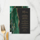Le bord gauche de cet élégant menu mariage moderne comporte une bordure d'aquarelle vert émeraude bordée d'une parties scintillant en faux or. Le texte personnalisable combine un script d'écriture fantaisiste couleur or et des polices de cuivre sur un arrière - plan noir en ardoise. L'envers est assorti d'une agate vert émeraude et or.