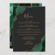 Cet élégant menu mariage moderne comprend des coins d'agate couleur vert émeraude ornés de parties scintillant en faux or. Le texte personnalisable combine un script d'écriture fantaisiste couleur or et des polices de cuivre sur un arrière - plan noir en ardoise. L'envers est assorti d'une agate vert émeraude et or.