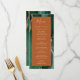Cet élégant menu mariage moderne est doté d'un arrière - plan d'aquarelle vert émeraude. Le texte personnalisable combine écriture manuscrite fantaisie couleur or avec polices italique et cuivre sur un arrière - plan orange brûlé ou rouille. L'envers est assorti d'une agate vert émeraude et or.