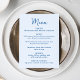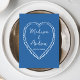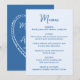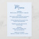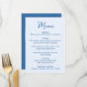 Partagez votre menu de réception avec style grâce à cette carte de menu de mariage fantaisiste conçue pour se coordonner avec du papier à lettres de mariage moderne et ludique. Le devant du menu présente le mot « Menu » dans une écriture bleue manuscrite avec les détails de votre menu de mariage affichés en dessous sur un fond bleu clair, créant une apparence fraîche et joyeuse pour vos tables de réception. Le verso de la carte de menu de mariage présente un cœur bleu clair dessiné à la main entourant les noms des mariés et la date du mariage, ajoutant un détail doux et cohérent. Parfaite pour les couples qui prévoient une célébration amusante et romantique, ce menu de réception de mariage personnalisable ajoute de la couleur et de la personnalité tout en gardant les sélections de menu faciles à lire pour les invités.
