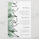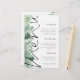Un prix économique de 5,5" x 8,5", sur un élégant stock LINEN de 110 lb - pour une sensation de luxe à un bon rapport qualité-prix, il est parfait pour les menus, ainsi que des invitations et des programmes, etc. Cette alternative de taille budgétaire est également disponible dans d'autres choix de papier. Le stock de carte SEMI-GLOSS 110 lb est à peu près de la même épaisseur qu'une carte postale, donc fonctionne bien aussi pour les invitations. Le papier FELT 100 lbs est de couleur bouffante, PAS blanc, donc ajoute une touche rustique. Le stock de papier MATTE 80lbs est blanc vif, pour une impression nette, idéal pour vos menus et programmes, tandis que le papier SATIN 80lbs est mince et léger, idéal pour les enceintes. VEUILLEZ NOTER QUE LES ENVELOPPES OPTIONNELLES SONT UN PEU PLUS GRANDES EN TAILLE À 6,75" x 9" env. Ce design moderne a Menu dans un élégant script défini qui tourne à gauche et le reste du texte est aligné à droite que vous pouvez facilement personnaliser ainsi que vos noms et date mariage au dos. Une bordure de feuilles d'euclyptus verdoyants se trouve à gauche sur le devant et à droite sur le dos.