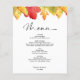 Célébrez votre mariage d'automne dans le style sans compromettre votre budget avec ce Budget Fall Leaves Mariage Menu. Doté d'illustrations charmantes de feuillage d'automne aux tons chauds, ce design de menu saisit la beauté confortable et rustique de la saison tout en offrant un moyen abordable d'élever vos tables de réception. La mise en page facile à lire dresse une liste élégante de chaque cours, ajoutant une touche attentive qui guide les clients dans l'expérience de dîner. C’est la solution idéale pour les couples qui cherchent à créer un look cohésif et saisonnier sans surdépenser.