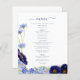 Magnifique artiste peint à la main fleurs sauvages et feuillage en bleu roux, bleu cornflower, bleu marine, violet et vert, idéal pour une journée unique de printemps ou d'été du menu mariage. Élégant script de typographie moderne en bleu marine complète la charmante boho à la main peinte à la main qui comprend des fleurs de maïs, pavot, cosmos, ne m'oubliez pas les noeuds et feuillage délicat. Menu mariage bohème chic parfait pour une prairie de printemps, mariage d'été dans le jardin. OEuvre originale de l'artiste Catherine Sweetman