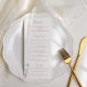 Elevez votre table de réception avec ce menu mariage mauve à fleurs, avec un script élégant, un agencement minimaliste et une délicate illustration de fleurs. Parfait pour les thèmes romantiques, pastel ou mariage moderne, ce menu ajoute une touche raffinée et personnelle à vos lieux. Customisez facilement les menus et l'agencement pour correspondre à votre style mariage, que vous soyez en train de servir un dîner ou un buffet. Imprimé sur papier de haute qualité, il est à la fois fonctionnel et beau. S'aligne parfaitement avec les invitations mauves à la floraison, les cartes RSVP et la signalisation du jour de mariage pour une célébration cohésive.