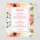 Carte de menu Budget Spring Orange Floral Mariage (taille 4,5"x 5,6") Elégante carte de menu de mariage a un arrière - plan floral intense ressort. Les fleurs d'aquarelle sont orange, rose et violet. La section texte de ce menu est simple en raison d'un arrière - plan floral vif. "Budget" dans le titre signifie prix abordable pour les clients. Cette carte de menu mariage fait partie de "Spring Orange Floral Collection A101" où vous trouverez une variété de produits mariages coordonnés. Il y a deux façons de les trouver : 1) Visitez la collection entière à : https://www.zazzle.com/collections/spring_orange_floral_collection_a101-119588692587736567 ou 2) Écrivez A101 dans la boîte de recherche de CETTE boutique Pour toute autre information, veuillez nous contacter szdesigns2021@gmail.com