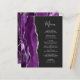 Le bord gauche de cet élégant menu mariage moderne comporte une bordure d'aquarelle violette ornée d'une parties scintillant en faux argent. Le texte personnalisable combine écriture manuscrite gris argenté et polices cuivre sur un arrière - plan non noir. L'envers est assorti d'un design d'agate violet et argenté.