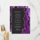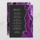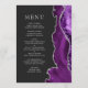 Le bord droit de cet élégant menu mariage moderne comporte une bordure d'aquarelle violette ornée d'une parties scintillant en faux argent. Le texte personnalisable combine des polices de serif romaine gris argenté et des polices de cuivre sur un arrière - plan non noir. L'envers est assorti d'un design d'agate violet et argenté.