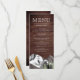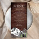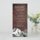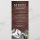 Elégante carte de menu rustique mariage avec de belles montagnes enneigées et des pins avec typographie moderne contre un arrière - plan en bois de grange.