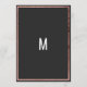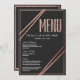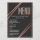 Le noir élégant, chic, et moderne et rayés linéaires d'or rose imprimés par faux et décrivent le détail avec la typographie rose d'or sur un arrière - plan noir, cartes de menu de réception de mariage. Cette conception classique et sophistiquée est parfaite pour la réception de mariage chique, élégante, et à la mode. Personnalisez avec votre propre menu sur l'avant, avec vos noms et dates. Customisez alors le dos avec votre initiale de monogramme. Toute la conception d'impression de photo.