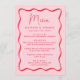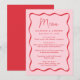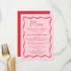 Ajoutez une touche vintage à votre fête de fiançailles, dîner de répétition ou réception de mariage avec ce menu de mariage à cadre ondulé rose et rouge moderne. Le design affiche les noms des mariés, la date du mariage et les options de menu en caractères gras rouges entourés d'une bordure de cadre ondulé rouge sur fond rose. Le menu de mariage rétro est coordonné avec notre collection de mariage à cadre ondulé moderne.
