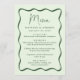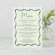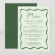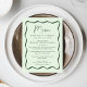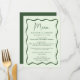Ajoutez une touche vintage à votre fête de fiançailles, dîner de répétition ou réception de mariage avec ce menu de mariage moderne à cadre vert ondulé. Le design affiche les noms des mariés, la date du mariage et les options de menu en caractères gras verts entourés d'une bordure de cadre ondulé vert sur un fond vert clair. Le menu de mariage rétro est coordonné avec notre collection de mariage Modern Wavy Frame.