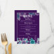 Faites une déclaration audacieuse et moderne avec ce menu mariage, avec un design étonnant dans des tons violets et turquoises riches. Le motif floral vibrant sur un arrière - plan violet profond offre un look unique et élégant, parfait pour les mariages contemporains, en soirée ou à thème. Les couleurs contrastées et les fontes élégantes attirent l'attention, faisant de ce menu un élément frappant de votre décoration. Customisez le texte du menu, les noms et la date du mariage pour créer une conception qui vous est propre. Ce modèle fait également partie d'une collection de coordination, vous permettant de styliser tous vos accessoires mariages de manière unifiée et mémorable.