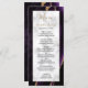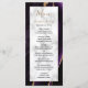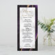 Ce menu mariage moderne et élégant présente un arrière - plan d'agate violet d'aquarelle orné d'une fausse parties scintillant dorée. Le texte apparaît dans une écriture manuscrite élégante de couleur or et une police en cuivre noir sur un rectangle en marbre gris et blanc. La conception de l'agate est répétée à l'envers.