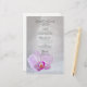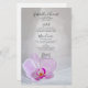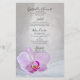 Customisez le joli menu Mariage Orchidée rose et Voile avec les détails du repas que vous pourrez servir à votre dîner ou déjeuner mariage en ajoutant la salade ou le premier plat, l'entrée ou le deuxième plat et le dessert ou le troisième plat. Personnalisez-le avec le nom de la mariée et du marié, le lieu de réception et la date de la cérémonie de mariage. N'hésitez pas à modifier le texte ou la police en fonction de vos besoins nuptiaux. Cet élégant menu mariage à fleurs présente une photographie florale d'une fleur d'orchidées phalaenopsis rose avec un voile de mariée. Idéal pour le couple qui a planifié un thème classe de fête de jardin.