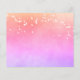 Carte de menu mariage romantique en colos arc-en-ciel doux, violet, violet, violet, pêche et doré. Avec un cadre en faux or et des oiseaux blancs volant. Modèles pour vos noms, date et le menu mariage. Lettres violettes. Dos : le même arrière - plan que sur le devant.