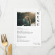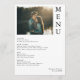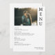 Célébrez votre mariage avec style grâce à ce menu Couple Photo Mariage! Doté d'un design moderne incluant la photo, ce menu ajoute à toute saison un beau charme à votre réception tout en gardant les coûts abordables. Caractéristiques : - Beau design photo - parfait pour toute cérémonie de mariage - Polices modernes élégantes - élégant mais facile à lire - Entièrement personnalisable - personnalisable avec vos éléments de menu, les noms des couples et la date du mariage Ce menu est parfait pour tous les types d'évènements mariages, ce menu de mariage abordable mais élégant ajoute une touche chaleureuse et festive à votre journée spéciale.