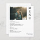 Célébrez votre mariage avec style grâce à ce menu de Mariage photo Couple abordable! Doté d'un design moderne incluant la photo, ce menu ajoute à toute saison un beau charme à votre réception tout en gardant les coûts abordables. Caractéristiques : - Beau design photo - parfait pour toute cérémonie de mariage - Polices modernes élégantes - élégant mais facile à lire - Entièrement personnalisable - personnalisable avec vos éléments de menu, les noms des couples et la date du mariage Ce menu est parfait pour tous les types d'évènements mariages, ce menu de mariage abordable mais élégant ajoute une touche chaleureuse et festive à votre journée spéciale.