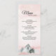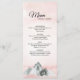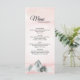 Ce menu mariage Rose Sunrise Mountain apporte une touche classe et unique, mais simple et décontractée à votre réception de mariage ou événement. Les nuances de soleil levant et couché de rose, mauve, pêche, rougit, corail et rose poussiéreux, baisé de parties scintillant d'or étoilé autour du texte de calligraphie stylisé apporte une nature paisible et minimale aux montagnes gris aquarelle pour une célébration de mariage sur le thème de la montagne.