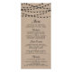 Simple mais élégant, les lampes à cordes de la collection rustique Kraft mariage est un design époustouflant avec de belles lumières à cordes blanches suspendues sur un arrière - plan à effet Kraft, qui est parfait pour toute célébration mariage rustique. Ces cartes de menu peuvent être personnalisées pour votre occasion spéciale et feraient le menu parfait pour votre mariage, douche nuptiale, fête de fiançailles, fête d'anniversaire et bien d'autres occasions spéciales. Ajoutez votre libellé personnalisé à cette conception à l'aide des cases "Modifier ce modèle de conception" situées à droite de l'élément, ou cliquez sur le bouton bleu "Customiser" pour arranger le texte, modifier les polices et les couleurs et ajouter des informations ou des images supplémentaires à cette conception. AFFICHER LES ÉLÉMENTS CORRESPONDANTS POUR CETTE COLLECTION