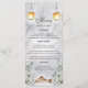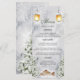 Rehaussez votre réception de mariage hivernal avec ce menu de mariage en cabane d'hiver enchanteur. Ce design rustique présente une charmante cabane enneigée nichée parmi les pins chargés de neige, évoquant une sensation de chaleur confortable et la magie d'un pays des merveilles hivernal. La lueur douce des lanternes ajoute une touche d'ambiance romantique, complétant parfaitement votre décor de réception. Cette carte de menu informe non seulement vos invités du festin délicieux à venir, mais ajoute également une touche d'élégance rustique à votre décor de table. Idéal pour les couples qui rêvent d'un mariage de conte de fées hivernal avec une touche de charme rustique.