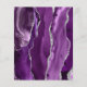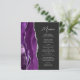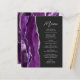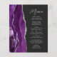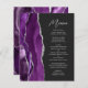Cet élégant menu mariage moderne comprend une bordure d'aquarelle violette ornée d'une parties scintillant en faux argent. Le texte personnalisable combine écriture manuscrite gris argent et polices sans serif sur un arrière - plan noir ardoise. Le design d'agate violet et argenté est répété à l'envers.