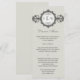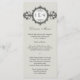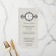 Carte de menu qui prend son influence de l'époque Art Déco. Un groupe orné, qui ressemble à une montre victorienne, présente un médaillon tenant le monogramme du couple. L'arrière - plan taupe pâle imprime un motif subtil comme filigrane. Ajoutez ou réduisez l'espace entre le premier et le dernier initiales pour équilibrer avec le monogramme central. Ajoutez un menu customisé en dessous. Un look classique qui donne l'ambiance à n'importe quel mariage. Disponible en couleurs alternatives avec les produits correspondants. com. com.