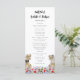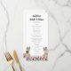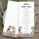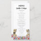 Dégustez vos invités avec ce menu mariage à thème de dinosaures amusant avec la mariée T-Rex et le marié dans une prairie fleur sauvage préhistorique colorée. Facile à customiser avec les noms des mariés et mariés, la date du mariage et tous les détails du menu mariage dans le script de typographie moderne. Fun Tyrannosaurus Rex marié et groom dino et aquarelle illustrations florales dans les tons rose bleu violet jaune orangé et vert. Dino original unique oeuvre de l'artiste Catherine Sweetman