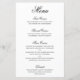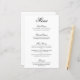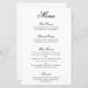 Élégant et classique menu mariage de style simple avec un design simple avec "menu" et les en-têtes de cours dans une calligraphie noire formelle et les descriptions de cours dans une police serif sur un arrière - plan blanc. Un design traditionnel et classe, parfait pour un mariage de cravate noire. Ces menus mariages bon marché sont imprimés sur des feuilles de papier pour une option économique.