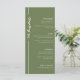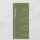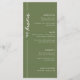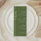 Une carte de menu mariage vert olive moderne et élégante. Customisez avec les éléments du menu mariage, ainsi que vos noms et votre date de mariage au bas de la carte.