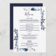 Cet élégant menu mariage floral bleu marine et blanc peut être personnalisé avec vos informations dans la typographie moderne. Conçu par Thisisnotme©
