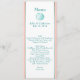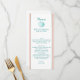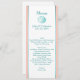 Le long et maigre menu de table de mariage fait dans le blanc, avec le corail et l'aqua barre en bas du côté et des graphiques d'un coquillage coloré par aqua, au dessus. Personnalisez tout le texte coloré par aqua pour adapter à votre menu de réception de mariage. Belle addition à votre réception de mariage de thème de plage.