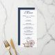 Conçu pour coordonner avec mon Seashells Message dans une collection mariage de bouteilles, ce menu d'événements marine et blanc présente les noms de marié et marié dans un élégant script d'écriture manuscrite, la date mariage, vos entrées, entrées et desserts ainsi que des décorations de coquillages d'aquarelle au fond. Le côté inverse est bleu marine solide. Personnalisez facilement l'utilisation du modèle de conception - remplacez simplement l'exemple de texte par vos propres informations de menu. Si vous avez besoin d'ajuster la taille de la police ou de repositionner quoi que ce soit, cliquez sur "Customiser plus loin".