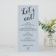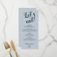 Donnez le ton pour une expérience culinaire élégante grâce à ce menu minimaliste Dusty Blue "Let's Eat" ! Avec son design épuré et moderne aux tons bleus poussiéreux subtils, ce menu ajoute une touche sophistiquée et raffinée à votre événement mariage ou spécial. Parfait pour des thèmes contemporains, rustiques ou classiques, il présente avec soin vos choix de repas dans un style épuré. Ce menu chic et sobre est l'ajout parfait à votre décor d'évènement, rehaussant vos paramètres de table avec une élégance sans effort.