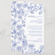 Elevate your event tables with this timeless blue and white floral wedding or bridal shower menu. Featuring delicate botanical illustrations in a refined chinoiserie-inspired style, this elegant design blends classic romance with fresh, modern sophistication. The soft blue florals frame your menu selections beautifully, while the graceful script heading adds a touch of effortless charm—perfect for garden celebrations, formal receptions, or a vintage-inspired soirée.