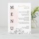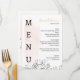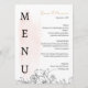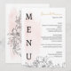 Impressionnez vos invités avec ce menu de mariage élégant avec une toile de fond couleur pastel et des illustrations florales noires raffinées. La disposition verticale "MENU" ajoute une touche moderne et sophistiquée, tandis que la conception délicate maintient une atmosphère romantique et intemporelle. Parfait pour un thème mariage contemporain, élégant, jardin ou jardin, il complète votre style de table de réception avec une beauté sans effort.