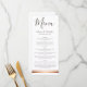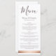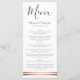 Un menu mariage blanc moderne avec deux ornements en cuivre rayé au bas de la carte. Ce menu comporte les noms de la mariée et du marié et leur date de mariage, ainsi qu'un espacement suffisant pour inclure vos choix de menu.