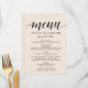 Moderne et chic neutre crémeux chaud blanc et noir cartes de menu mariage disposent d'un design typographique noir élégant avec des accents de script de calligraphie audacieux et un texte personnalisé élégant qui peut être personnalisé avec vos délicieux détails du menu du dîner et un monogramme des noms de mariée et de mariée et la date de mariage.