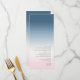 L'arrière - plan pour les pièces de cet ensemble mariage minimaliste est un dégradé de couleurs saisissant du bleu prussien au rose et blanc doux. La carte de menu mariage présentée ici présente un design élégant et moderne et une police sans serif contemporaine pour ajouter à son attrait. Ajoutez facilement vos sélections de menu, vos initiales et la date du mariage à l'aide du modèle fourni. Recherchez ID741 pour voir l'ensemble complet des produits correspondants dans Ciel prussien ou choisissez l'une des autres combinaisons de dégradé disponibles pour convenir à votre palette de couleurs mariages.