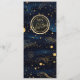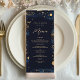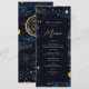 Élevez vos tables de réception avec cette élégante carte de menu de mariage céleste, dotée d'un fond bleu marine profond, de délicates touches célestes dorées et d'un monogramme coordonné au dos pour un look raffiné et cohérent.