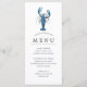 Menus de nourriture personnalisés sur le thème du homard bleu pour votre prochaine fête du homard ou événement de fruits de mer. Il présente une illustration de style aquarelle d'un homard bleu. En dessous, il y a des espaces pour les informations de menu de votre événement.
