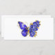 Bijoux, bleu, saphir, papillon aux fleurs pétillantes avec aile décorée de bleu, fleurs précieuses avec feuilles d'or sur arrière - plan blanc.
