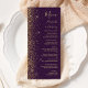 Le bord gauche de cet élégant menu mariage moderne présente un style de parties scintillant en faux or. Le texte personnalisable combine écriture manuscrite dorée, cuivre et polices italiques sur un arrière - plan violet foncé. L'envers présente une parties scintillant violet et dorée assortie.