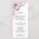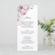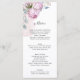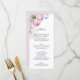 Ce menu mariage est décoré d'un arrière - plan rose pastel aux couleurs pastel, agrémenté d'oeuvres d'art florales à l'aquarelle. Sur le côté gauche, les délicats pivoines roses et les feuilles verdoyants se cascades gracieusement, ajoutant une touche romantique et organique. La disposition est propre et équilibrée, avec une typographie élégante dans un mélange de polices cursive fluides et serif classique qui véhiculent sophistication et chaleur. Le design général est intemporel et accueillant, parfait pour un jardin ou une fête vinicole.
