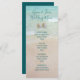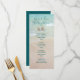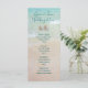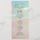 Grand modèle de menu mariage avec un arrière - plan de plage tropical et dollars de sable. Une carte simple, mais belle avec de l'eau bleue et du sable de plage comme l'arrière - plan du texte bleu. Noms de la mariée et du marié, avec le titre "Menu Mariage" en haut des cartes plates de 4x9 pouces. Deux, les dollars de sable naturel représentent le couple. Le texte de la partie menu est ajouté dans un paragraphe à l'aide de lettres majuscules pour diviser les sections, comme les "entrées", les "entrées" et les "desserts". Le paragraphe est aligné en haut, donc ajoutez des espaces au besoin, ou supprimez-les, pour adapter le libellé de votre menu. Reverse est un graphique bleu qui correspond à l'eau.