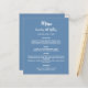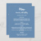 Un arrière - plan bleu poussiéreux et tendance, texte blanc. Avant : Personnalisez et ajoutez votre nom, votre date et le menu. Retour : Programme. Si vous avez un grand programme, vous pouvez réduire l'espacement des lignes. 1 feuille = 1 menu/programme imprimé bord à bord.