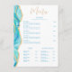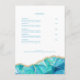 Un autre menu de restaurant élégant par Blue Sands Studio. Ce menu moderne présente un design aquarelle bleu aqua avec des détails de paillettes en faux or. Ressemblant à la pierre d'agate. Les polices serif classiques sont combinées avec une calligraphie élégante. Modèle facilement modifiable pour insérer vos sections de menu et vos articles. Présenté en Entrées, Plats d'accompagnement, Soupe & Salade, et Dessert. Si vous avez besoin d'aide ou de conseils, veuillez m'envoyer un message Zazzle.