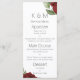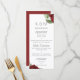 Ce menu élégant et romantique présente un design floral. Des roses rouges et de la verdure accentuent les coins supérieur droit et inférieur gauche. Vous pouvez remplacer les éléments de menu par les options alimentaires de votre choix. Il convient à un événement petit-déjeuner, brunch, déjeuner ou dîner, ou pour un mariage ou un banquet.