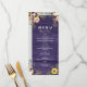 Elégante, moderne, botanique, menu mariage violet en bois rustique avec fleurs d'aquarelle, tournesols et verdure.