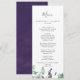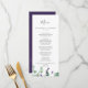Cette carte à la carte rustique à la lavande et à l'eucalyptus mariage est parfaite pour un mariage extérieur simple et élégant. Le design floral présente des feuilles d'eucalyptus aquarelle et de la verdure avec des sprigs de fleurs sauvages violets. Ce menu peut être utilisé pour une réception de mariage, un dîner de répétition ou tout événement.