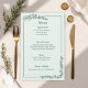 Partagez votre fête mariage avec des invités dans le style grâce à cette carte de menu rustique monochrome mariage. Doté de motifs floraux et d'élégantes polices de caractères, ce design s'ajoute parfaitement aux mariages de grange, de campagne ou de jardin. Disponible en bleu poussiéreux, vert sauge ou taupe chaud, la palette unicolore crée un look rustique intemporel. Customisez avec vos cours ou sélections de buffet pour compléter votre suite de papeterie de réception de mariage.